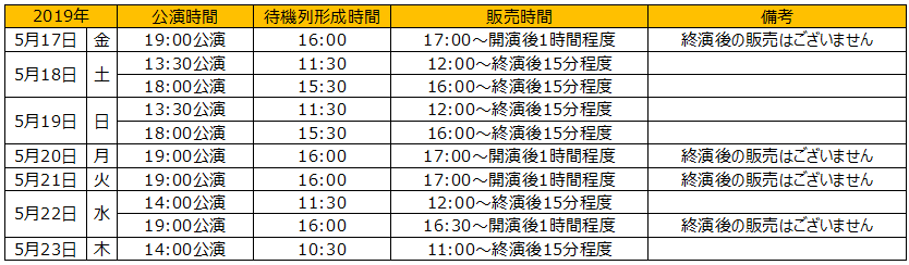 尚、本公演ではお時間の都合上、一部公演日につきましては終演後のグッズ販売がございません。